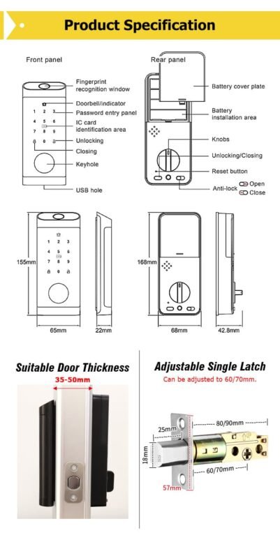 Unlocking Methods: Fingerprint, Password, IC Card, Bluetooth TTlock app, Keys