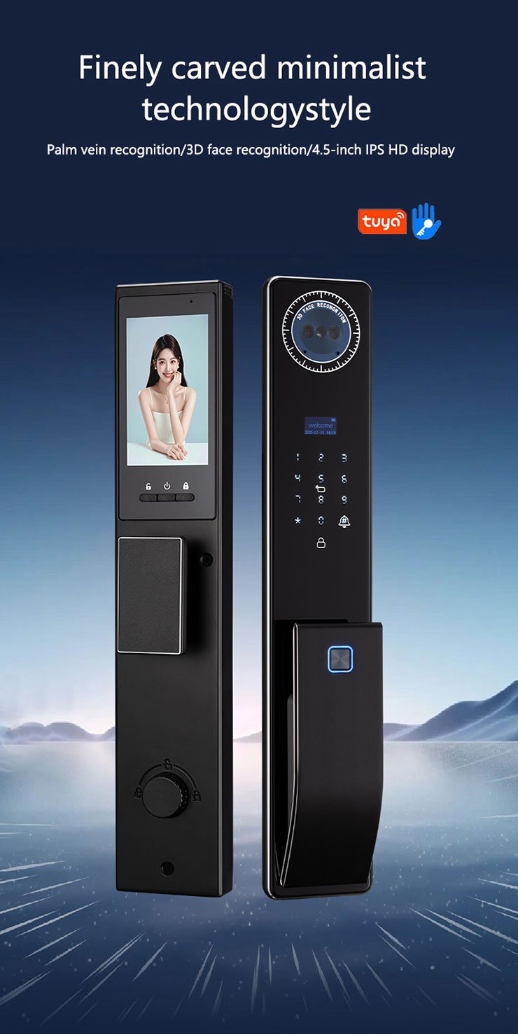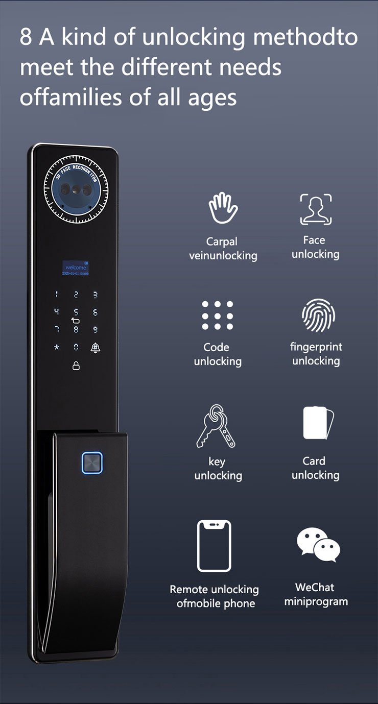 Unlock methods:Card, Fingerprint, Password, Key, App, NFC, Face recognition, Palm vein
