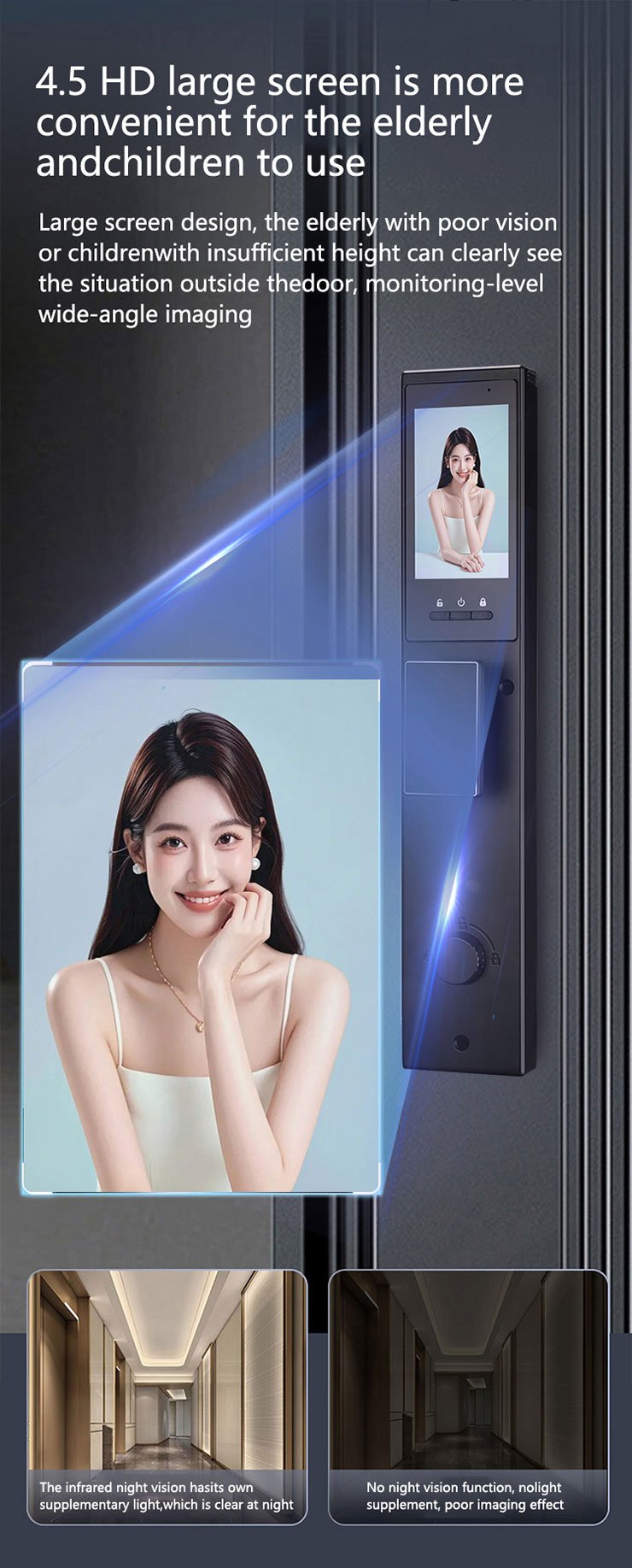 【Video Doorbell And Intercom】:When a visitor presses the doorbell, the indoor screen automatically lights up, and you can know the outdoor situation without opening the door. If you are not at home, you can also check who the visitor is via the app, talk to him, and open the door for him remotely.