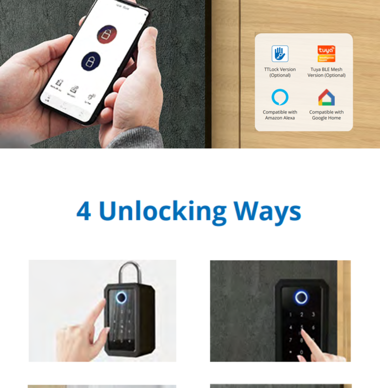 Multiple Access Methods – Open via smartphone app, PIN code, fingerprint, or emergency mechanical key