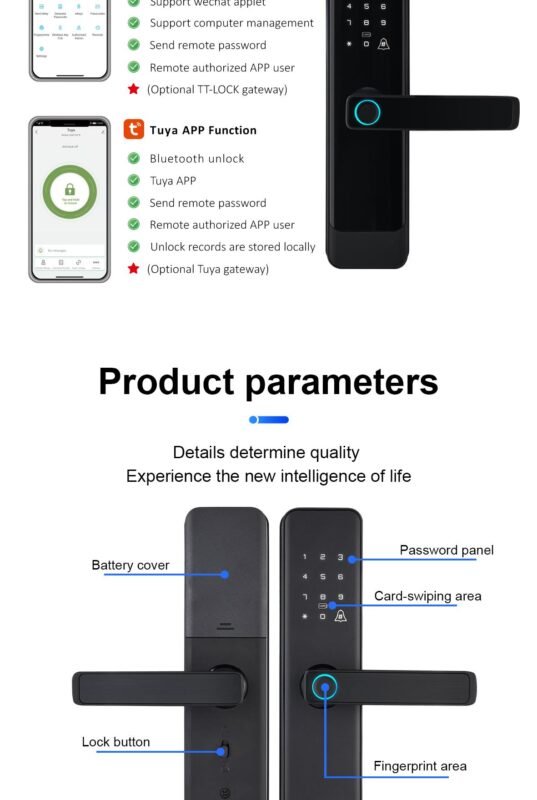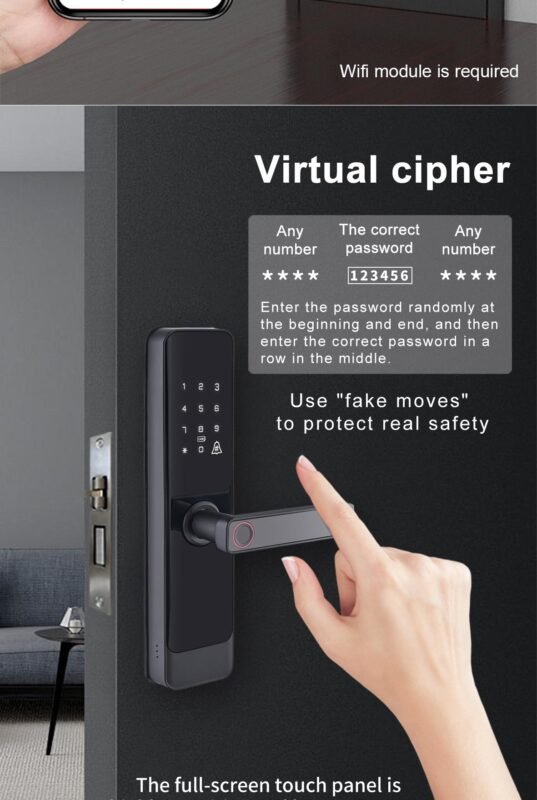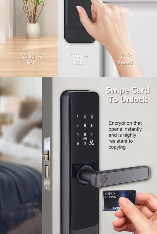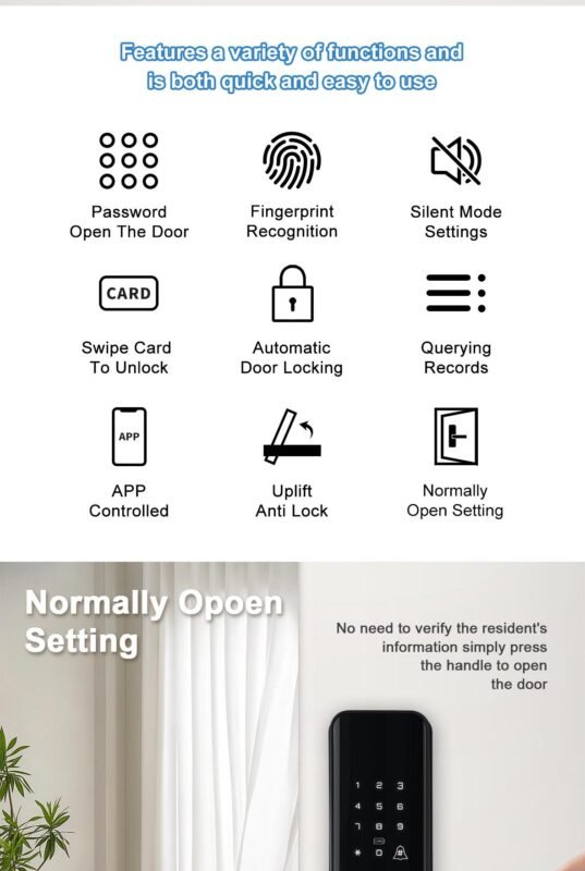 [Fingerprint recognition system and anti-peeping system]: The fingerprint recognition system deny to duplicate the prosthetic fingerprint. Support anti-peeping virtual password entry by entering a random passcode either before or after the correct password. This significantly improves the security of your door.