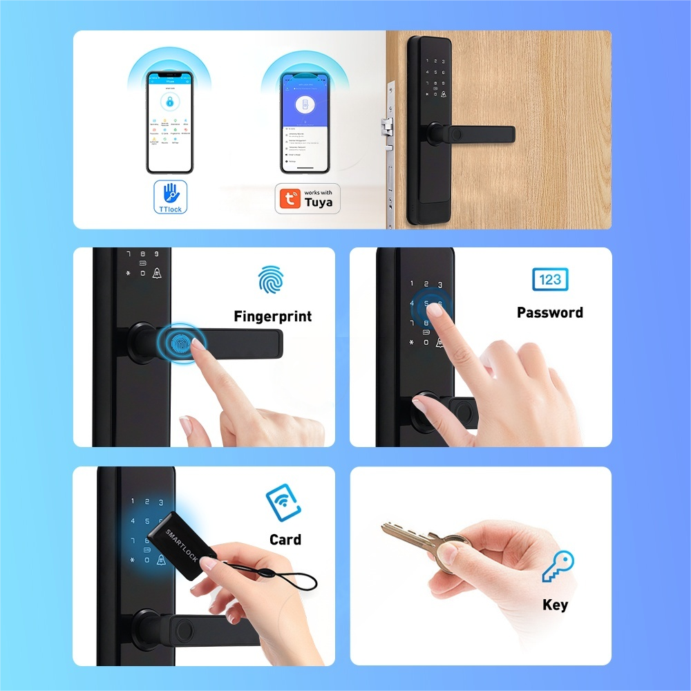 [5 Unlocking Methods]: Our Smart Door Lock has five ways for unlocking options: keyless entry through WiFi via the Tuya(Smart Life) App or Bluetooth via the TTLock App; fingerprint (biometric); M1 RFID Card; password on the keypad; and mechanical key for emergencies.