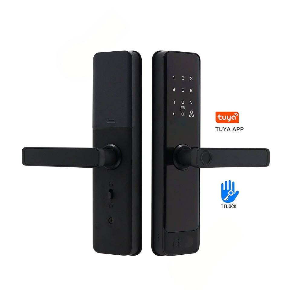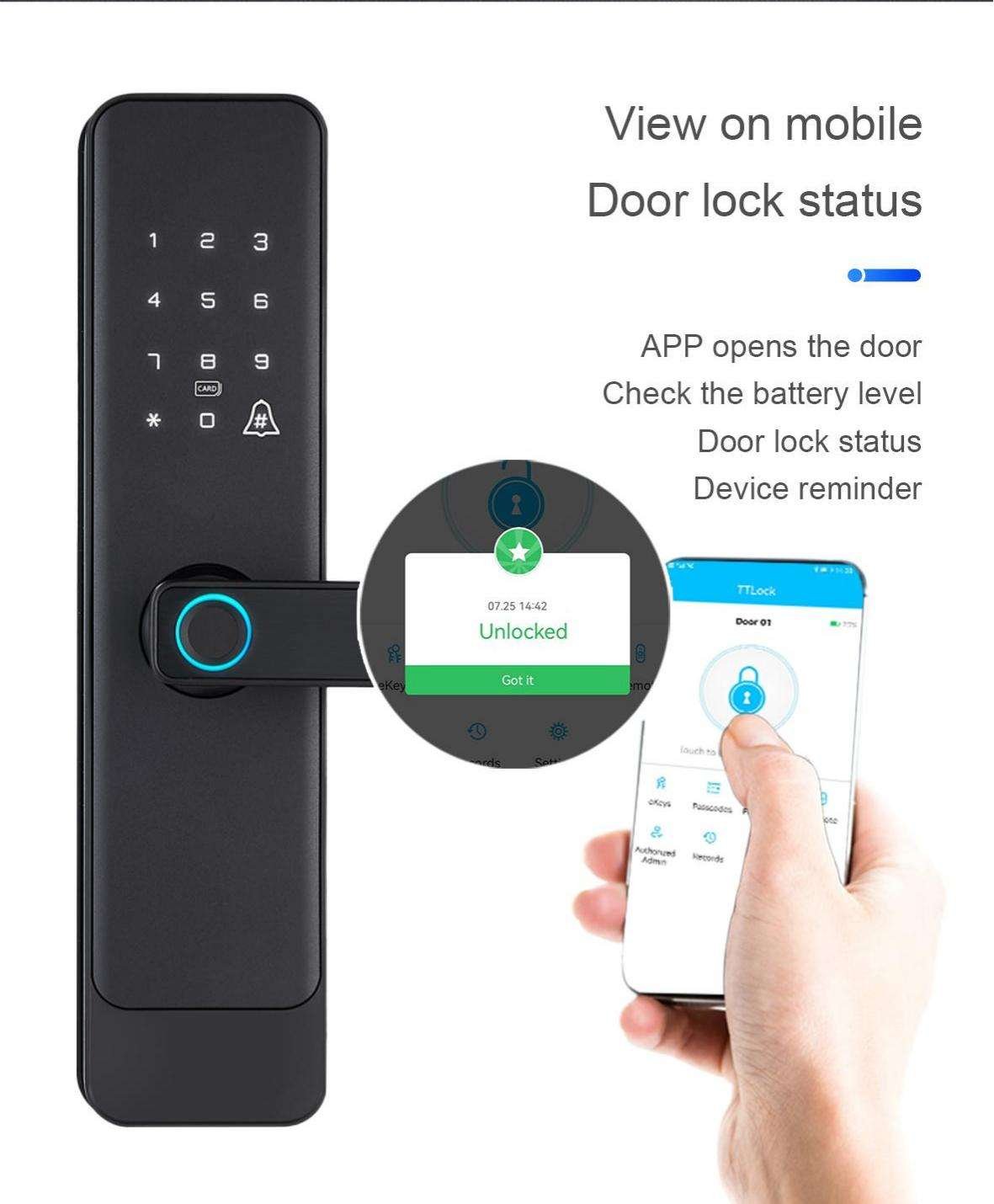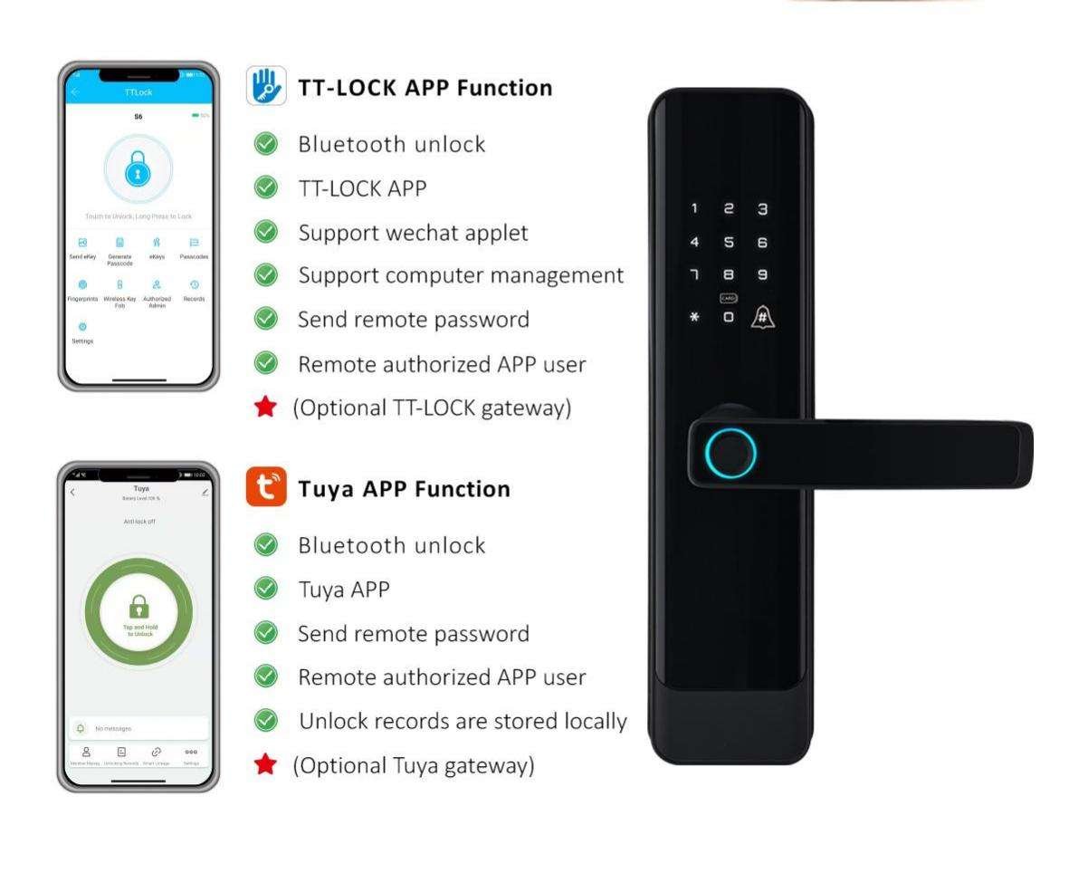 [5 Unlocking Methods]: Our Smart Door Lock has five ways for unlocking options: keyless entry through WiFi via the Tuya(Smart Life) App or Bluetooth via the TTLock App; fingerprint (biometric); M1 RFID Card; password on the keypad; and mechanical key for emergencies.